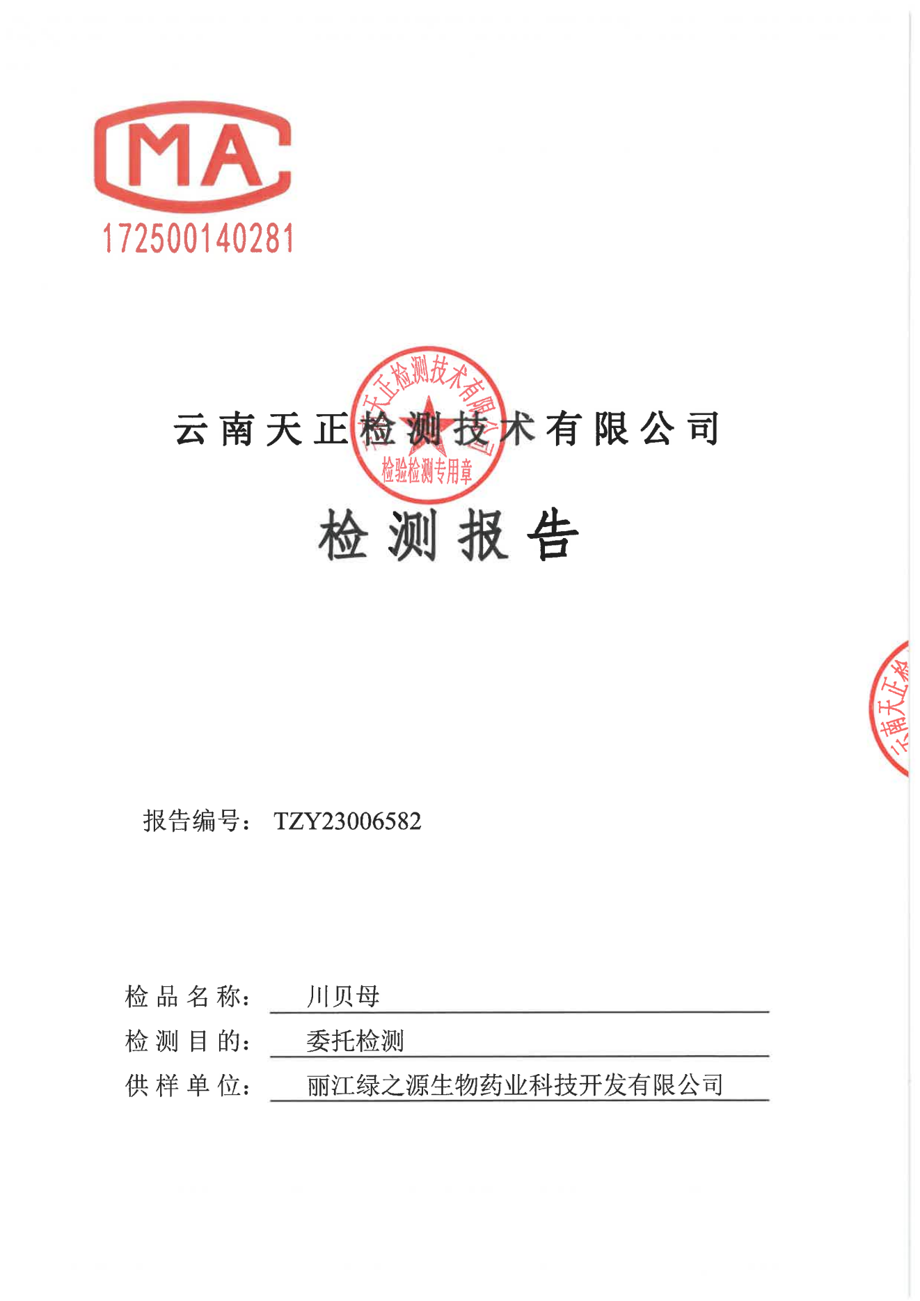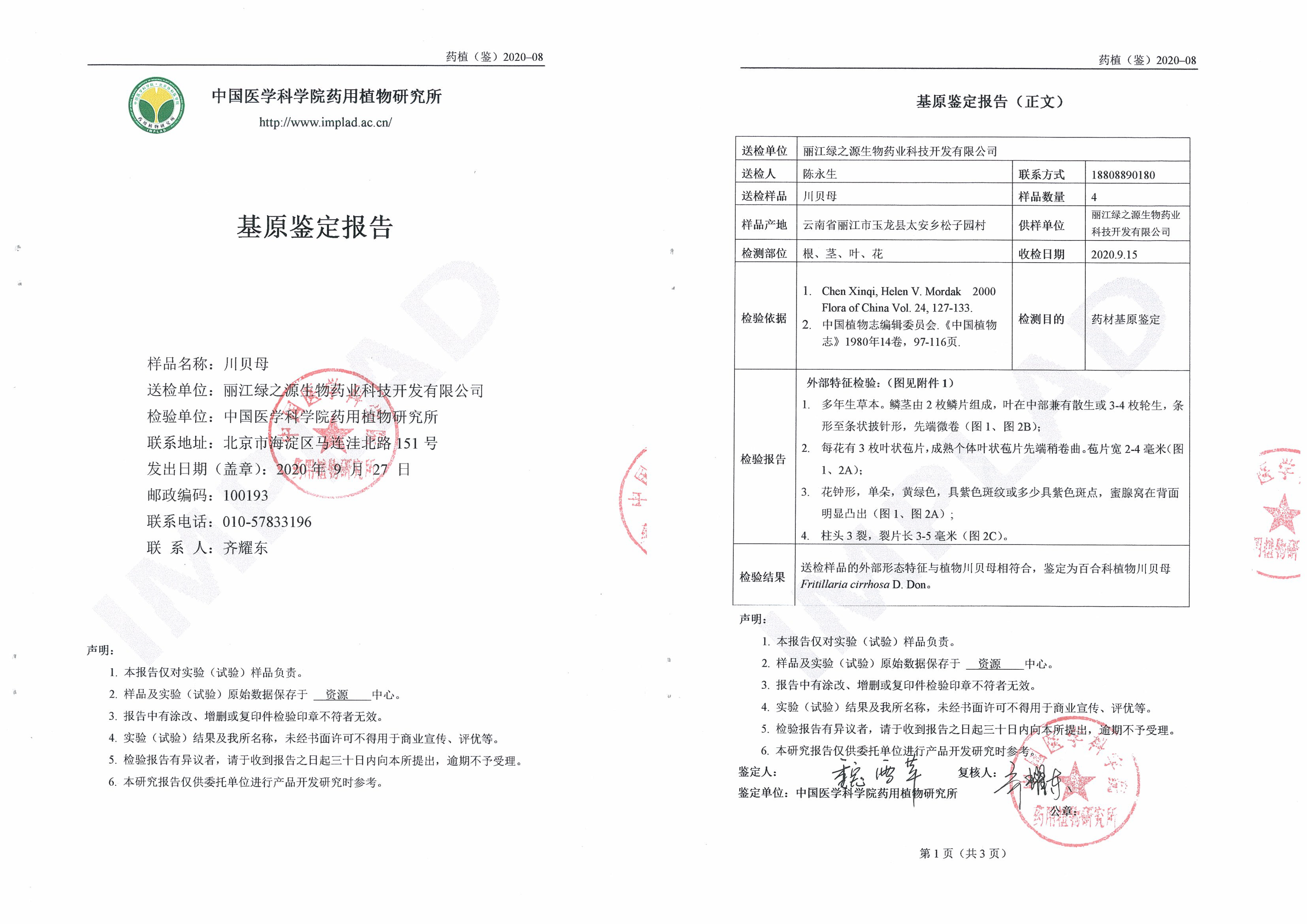 《川貝母基原鑒定證書》