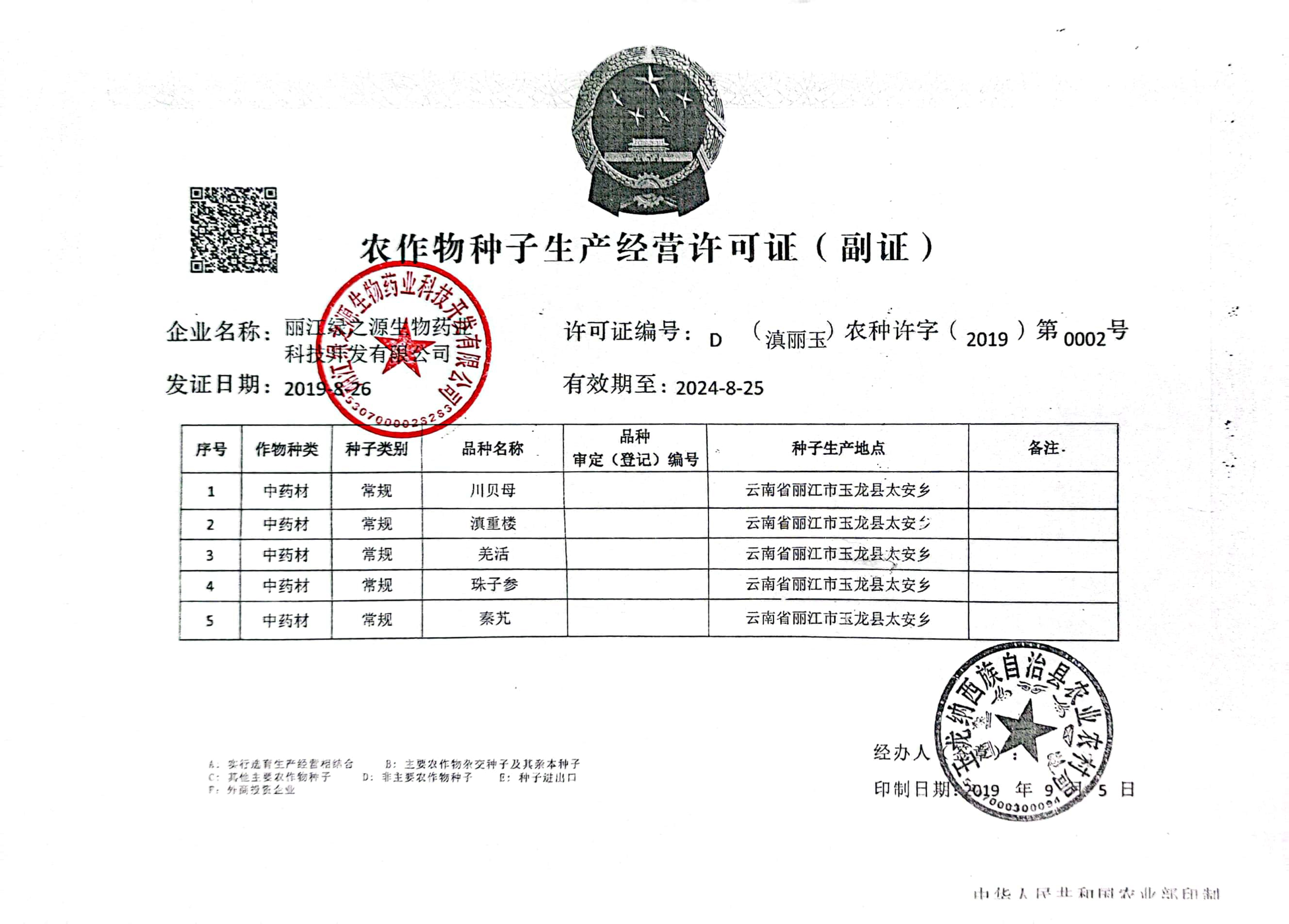 《川貝母種子經(jīng)營許可證》